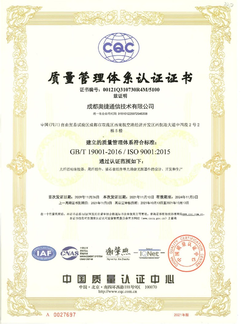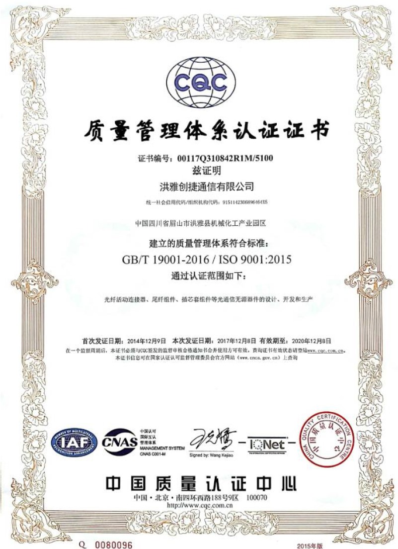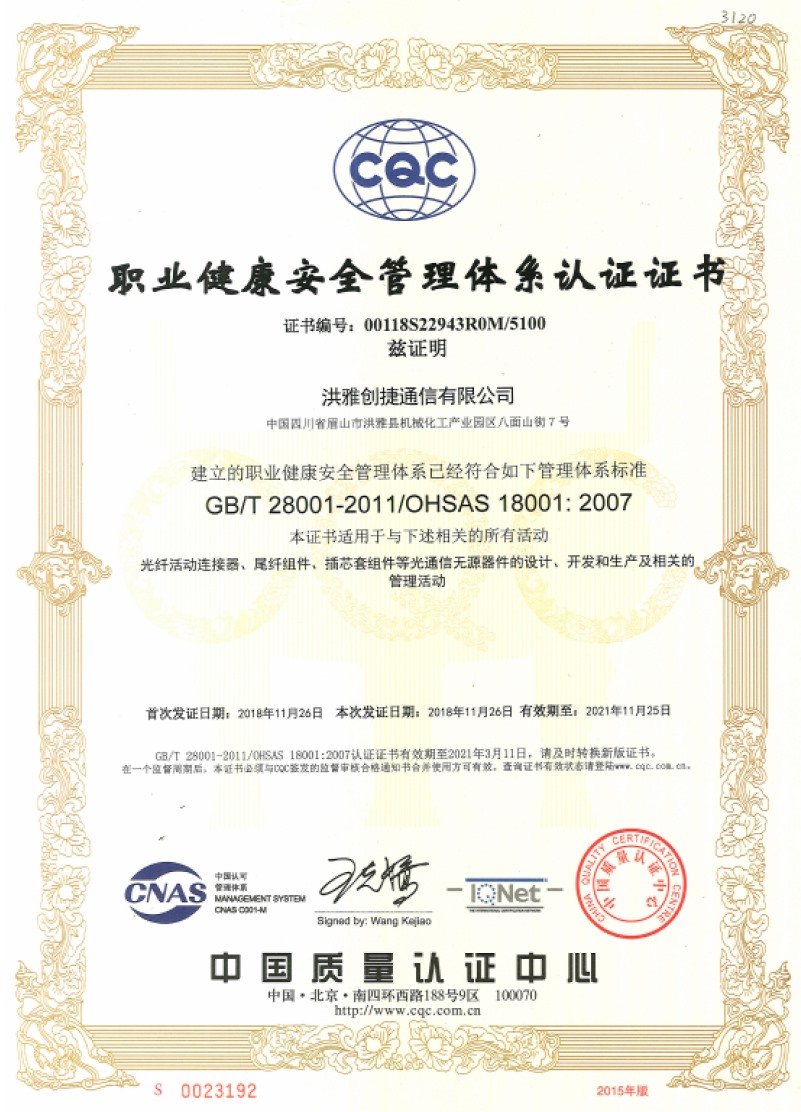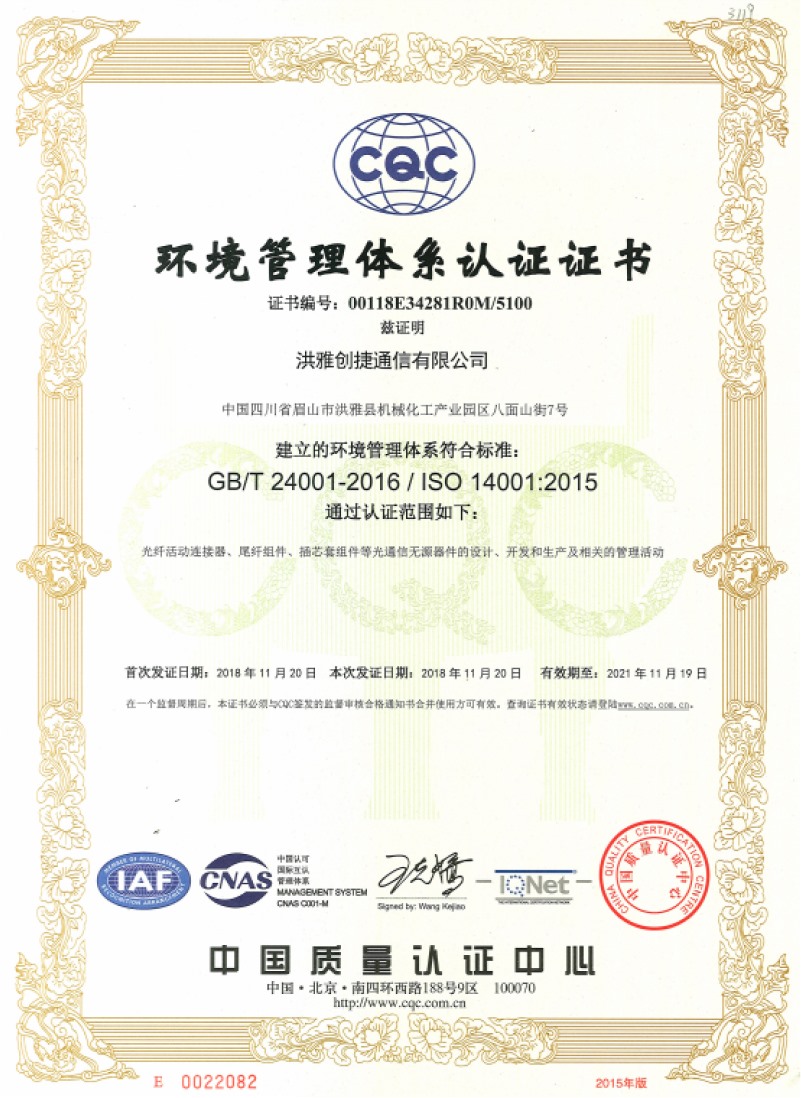 本公司依據(jù)ISO19001:2015標(biāo)準(zhǔn)建立了完善內(nèi)部質(zhì)量管理體系并通過(guò)中國(guó)質(zhì)量認(rèn)證中心認(rèn)證,主要的生產(chǎn)基地(子公司洪雅創(chuàng)捷通信有限公司)通過(guò)了ISO19001:2015、ISO14001:2015、ISO45001:2018體系認(rèn)證;